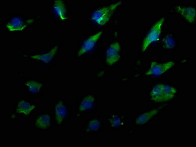 Immunofluorescence staining of U251 cells with CSB-PA023573OA01HU at 1:50, counter-stained with DAPI. The cells were fixed in 4% formaldehyde, permeabilized using 0.2% Triton X-100 and blocked in 10% normal Goat Serum. The cells were then incubated with the antibody overnight at 4°C. The secondary antibody was Alexa Fluor 488-congugated AffiniPure Goat Anti-Rabbit IgG(H+L).