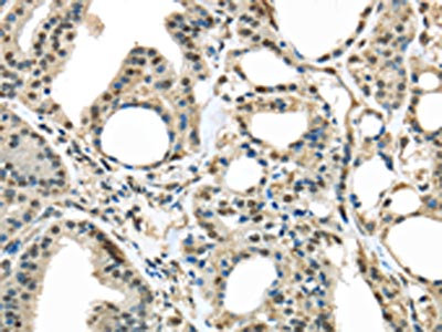 The image on the left is immunohistochemistry of paraffin-embedded Human thyroid cancer tissue using CSB-PA570820(TKT Antibody) at dilution 1/25, on the right is treated with fusion protein. (Original magnification: ×200)