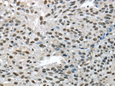 The image on the left is immunohistochemistry of paraffin-embedded Human breast cancer tissue using CSB-PA570820(TKT Antibody) at dilution 1/25, on the right is treated with fusion protein. (Original magnification: ×200)
