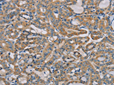 The image on the left is immunohistochemistry of paraffin-embedded Human thyroid cancer tissue using CSB-PA226880(TLR6 Antibody) at dilution 1/25, on the right is treated with fusion protein. (Original magnification: ×200)