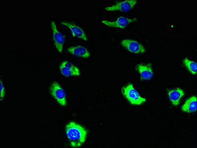 Immunofluorescent analysis of A549 cells using CSB-PA023779LA01HU at dilution of 1:100 and Alexa Fluor 488-congugated AffiniPure Goat Anti-Rabbit IgG(H+L)
