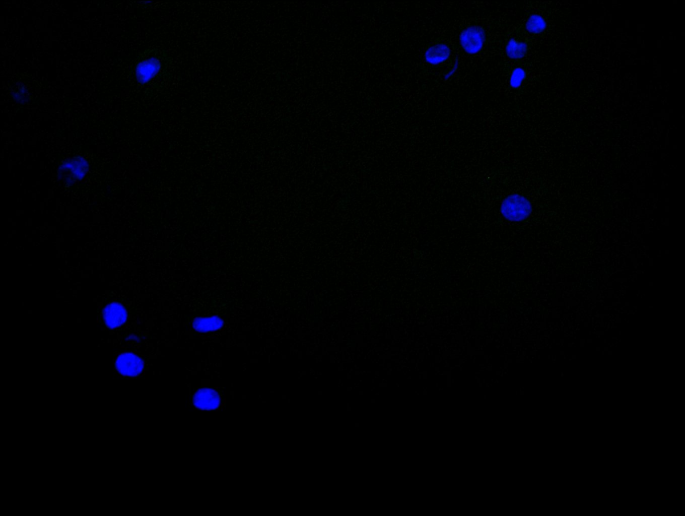 Immunofluorescence staining of PC-3 cell with CSB-PA023837LA01HU at 1:30, counter-stained with DAPI. The cells were fixed in 4% formaldehyde and blocked in 10% normal Goat Serum. The cells were then incubated with the antibody overnight at 4C. The secondary antibody was Alexa Fluor 488-congugated AffiniPure Goat Anti-Rabbit IgG(H+L).