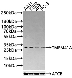 Positive WB detected in: A431 whole cell lysate(30μg), K562 whole cell lysate(30μg), 293 whole cell lysate(30μg), PC-3 whole cell lysate(30μg)