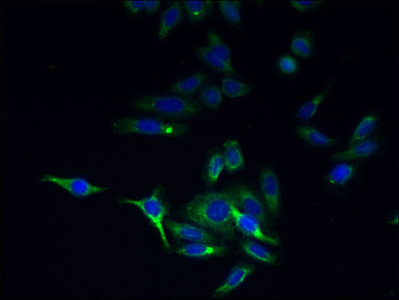 Immunofluorescent analysis of HepG2 cells using CSB-PA023841HA01HU at dilution of 1:100 and Alexa Fluor 488-congugated AffiniPure Goat Anti-Rabbit IgG(H+L)