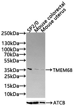 Positive WB detected in: SP2/0 whole cell lysate(30μg), Mouse colorectal tissue lysate(30μg),Mouse uterus tissue lysate(30μg)