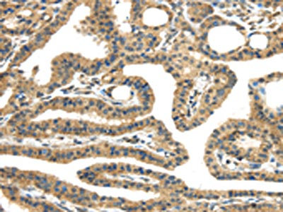 The image on the left is immunohistochemistry of paraffin-embedded Human thyroid cancer tissue using CSB-PA744019(TMPRSS11E Antibody) at dilution 1/30, on the right is treated with fusion protein. (Original magnification: ×200)