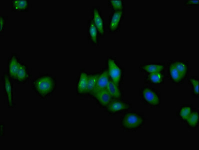 Immunofluorescent analysis of HepG2 cells using CSB-PA08189A0Rb at dilution of 1:100 and Alexa Fluor 488-congugated AffiniPure Goat Anti-Rabbit IgG(H+L)