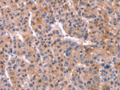 The image on the left is immunohistochemistry of paraffin-embedded Human liver cancer tissue using CSB-PA057490(TNFRSF17 Antibody) at dilution 1/30, on the right is treated with synthetic peptide. (Original magnification: ×200)