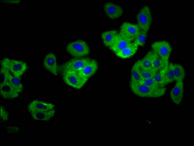 Immunofluorescence staining of HepG2 cells with CSB-PA023975LA01HU at 1:166, counter-stained with DAPI. The cells were fixed in 4% formaldehyde, permeabilized using 0.2% Triton X-100 and blocked in 10% normal Goat Serum. The cells were then incubated with the antibody overnight at 4°C. The secondary antibody was Alexa Fluor 488-congugated AffiniPure Goat Anti-Rabbit IgG(H+L).