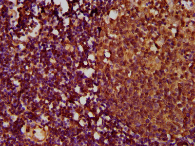 IHC image of CSB-PA023975LA01HU diluted at 1:500 and staining in paraffin-embedded human lymph node tissue performed on a Leica BondTM system. After dewaxing and hydration, antigen retrieval was mediated by high pressure in a citrate buffer (pH 6.0). Section was blocked with 10% normal goat serum 30min at RT. Then primary antibody (1% BSA) was incubated at 4°C overnight. The primary is detected by a biotinylated secondary antibody and visualized using an HRP conjugated SP system.
