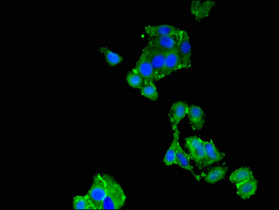 Immunofluorescent analysis of HepG2 cells using CSB-PA024009LA01HU at dilution of 1:100 and Alexa Fluor 488-congugated AffiniPure Goat Anti-Rabbit IgG(H+L)