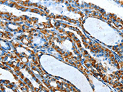 The image on the left is immunohistochemistry of paraffin-embedded Human thyroid cancer tissue using CSB-PA119248(TNNI3 Antibody) at dilution 1/20, on the right is treated with fusion protein. (Original magnification: ×200)