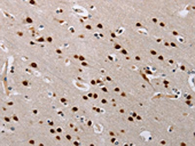 The image on the left is immunohistochemistry of paraffin-embedded Human brain tissue using CSB-PA286755(TONSL Antibody) at dilution 1/60, on the right is treated with fusion protein. (Original magnification: ×200)