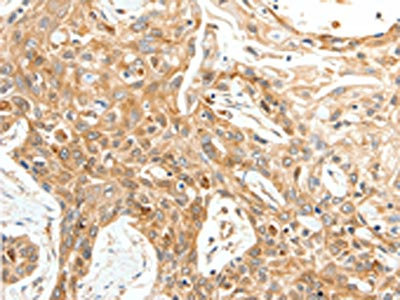 The image on the left is immunohistochemistry of paraffin-embedded Human lung cancer tissue using CSB-PA939174(TPM2 Antibody) at dilution 1/25, on the right is treated with synthetic peptide. (Original magnification: ×200)