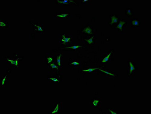 Immunofluorescence staining of SH-SY5Y cells with CSB-PA024114LA01HU at 1:100, counter-stained with DAPI. The cells were fixed in 4% formaldehyde and blocked in 10% normal Goat Serum. The cells were then incubated with the antibody overnight at 4°C. The secondary antibody was Alexa Fluor 488-congugated AffiniPure Goat Anti-Rabbit IgG(H+L).