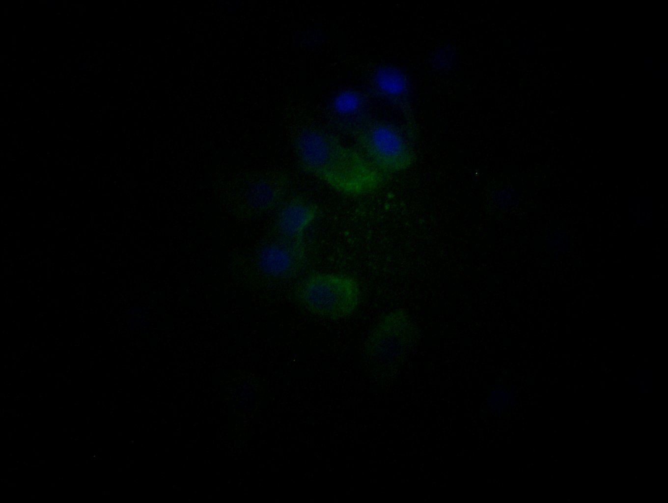 Immunofluorescence staining of HepG2 cells with CSB-PA897559LA01HU at 1:25, counter-stained with DAPI. The cells were fixed in 4% formaldehyde, permeabilized using 0.2% Triton X-100 and blocked in 10% normal Goat Serum. The cells were then incubated with the antibody overnight at 4°C. The secondary antibody was Alexa Fluor 488-congugated AffiniPure Goat Anti-Rabbit IgG(H+L).