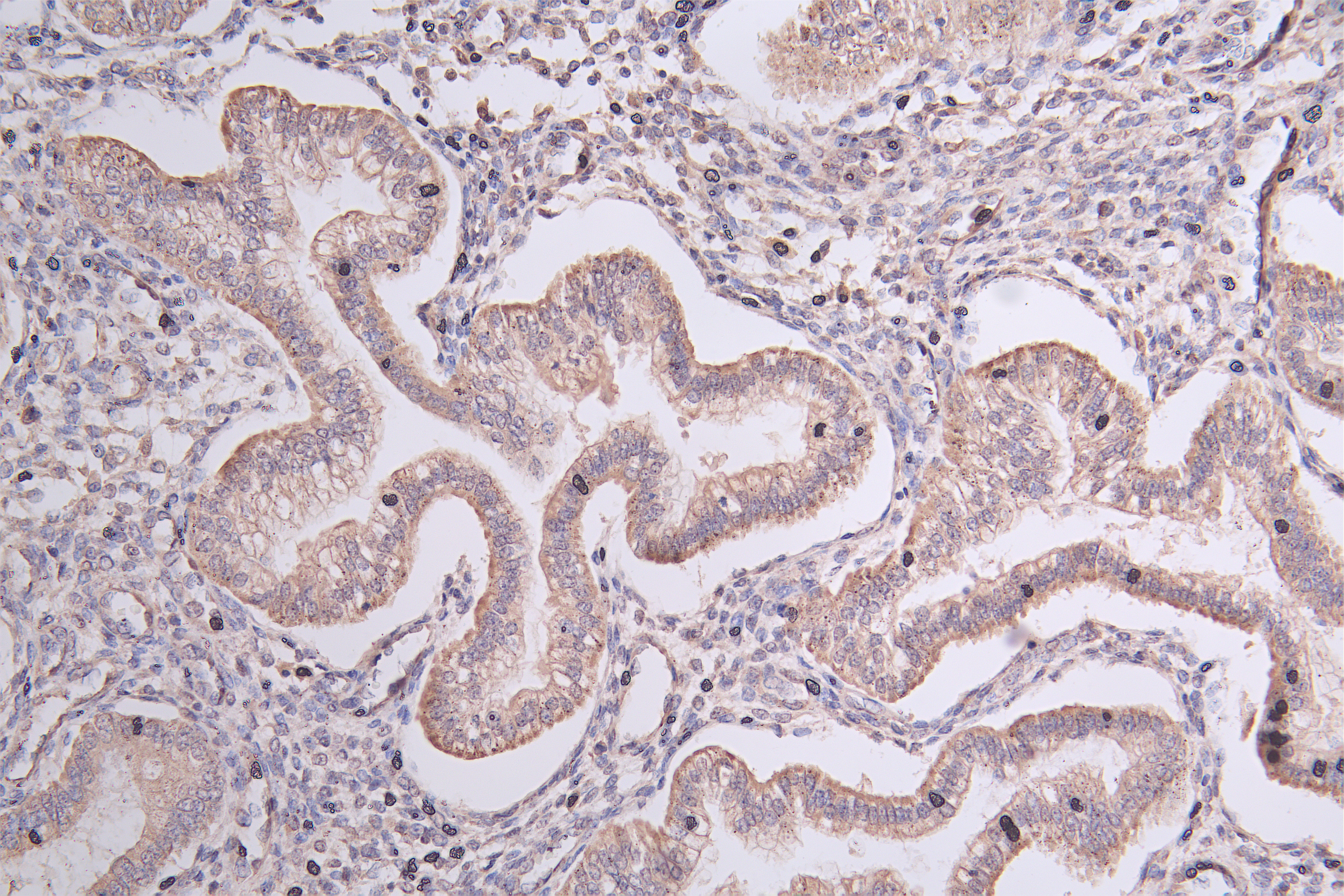 Immunohistochemistry of paraffin-embedded human endometrial cancer using CSB-PA897559LA01HU at dilution of 1:67