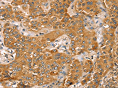 The image on the left is immunohistochemistry of paraffin-embedded Human liver cancer tissue using CSB-PA572337(TRIM45 Antibody) at dilution 1/45, on the right is treated with synthetic peptide. (Original magnification: ×200)