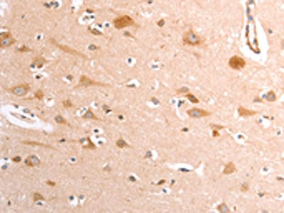 The image on the left is immunohistochemistry of paraffin-embedded Human brain tissue using CSB-PA558953(TRPV4 Antibody) at dilution 1/40, on the right is treated with fusion protein. (Original magnification: ×200)