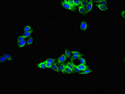 Immunofluorescent analysis of HepG2 cells using CSB-PA09499A0Rb at dilution of 1:100 and Alexa Fluor 488-congugated AffiniPure Goat Anti-Rabbit IgG(H+L)