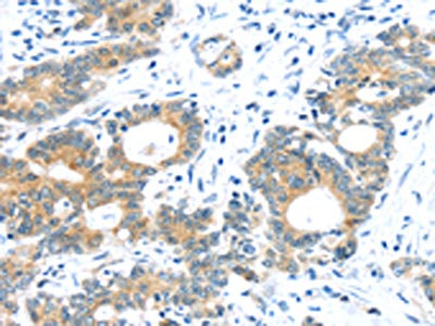 The image on the left is immunohistochemistry of paraffin-embedded Human colorectal cancer tissue using CSB-PA797924(TUSC1 Antibody) at dilution 1/30, on the right is treated with synthetic peptide. (Original magnification: ×200)