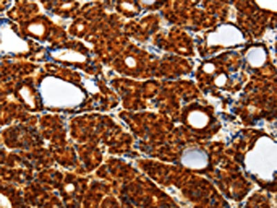 The image on the left is immunohistochemistry of paraffin-embedded Human thyroid cancer tissue using CSB-PA791069(TXN Antibody) at dilution 1/40, on the right is treated with synthetic peptide. (Original magnification: ×200)