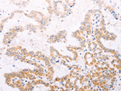 The image on the left is immunohistochemistry of paraffin-embedded Human thyroid cancer tissue using CSB-PA986893(TYR Antibody) at dilution 1/30, on the right is treated with fusion protein. (Original magnification: ×200)