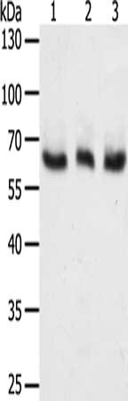 Gel: 10%SDS-PAGE, Lysate: 50 μg, Lane 1-3: A375 cells, Hela cells, Jurkat cells, Primary antibody: CSB-PA986893(TYR Antibody) at dilution 1/400, Secondary antibody: Goat anti rabbit IgG at 1/8000 dilution, Exposure time: 3 minutes