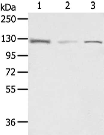 Gel: 6%SDS-PAGE, Lysate: 40 μg, Lane 1-3: 231, Jurkat and PC3 cell, Primary antibody: CSB-PA551947(UBA1 Antibody) at dilution 1/600 dilution, Secondary antibody: Goat anti rabbit IgG at 1/8000 dilution, Exposure time: 3 minutes
