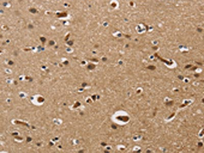 The image on the left is immunohistochemistry of paraffin-embedded Human brain tissue using CSB-PA142614(UBE2S Antibody) at dilution 1/40, on the right is treated with fusion protein. (Original magnification: ×200)