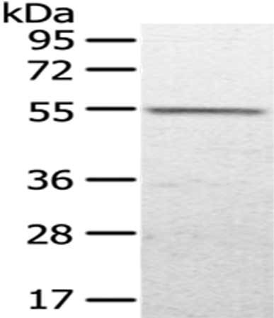 Gel: 8%SDS-PAGE, Lysate: 40 μg, Lane: Hela cell, Primary antibody: CSB-PA100573(UGP2 Antibody) at dilution 1/500 dilution, Secondary antibody: Goat anti rabbit IgG at 1/8000 dilution, Exposure time: 1 minute