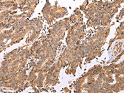 The image on the left is immunohistochemistry of paraffin-embedded Human prostate cancer tissue using CSB-PA569709(UQCRC2 Antibody) at dilution 1/25, on the right is treated with fusion protein. (Original magnification: ×200)