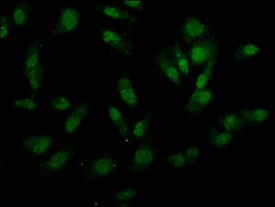 Immunofluorescence staining of Hela cells with CSB-PA025775LA01HU at 1:133, counter-stained with DAPI. The cells were fixed in 4% formaldehyde, permeabilized using 0.2% Triton X-100 and blocked in 10% normal Goat Serum. The cells were then incubated with the antibody overnight at 4°C. The secondary antibody was Alexa Fluor 488-congugated AffiniPure Goat Anti-Rabbit IgG(H+L).