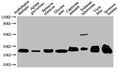 Positive WB detected in: Arabidopsis thaliana leaf tissue, Apium graveolens leaf tissue, Spinacia oleracea leaf tissue, Glycine max leaf tissue, Capsicum annuum leaf tissue, Solanum tuberosum leaf tissue, Vicia faba leaf tissue, Ipomoea batatas leaf tissue
