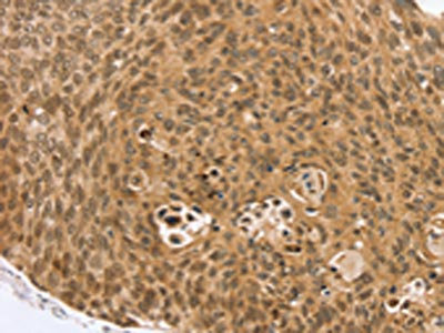 The image on the left is immunohistochemistry of paraffin-embedded Human esophagus cancer tissue using CSB-PA292260(VMP1 Antibody) at dilution 1/35, on the right is treated with synthetic peptide. (Original magnification: ×200)