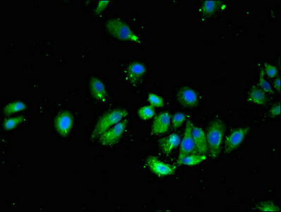 Immunofluorescent analysis of HepG2 cells using CSB-PA842635LA01HU at dilution of 1:100 and Alexa Fluor 488-congugated AffiniPure Goat Anti-Rabbit IgG(H+L)