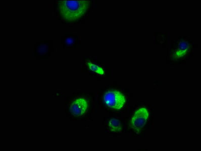 Immunofluorescence staining of MCF-7 cells with CSB-PA528516LA01HU at 1:166, counter-stained with DAPI. The cells were fixed in 4% formaldehyde, permeabilized using 0.2% Triton X-100 and blocked in 10% normal Goat Serum. The cells were then incubated with the antibody overnight at 4°C. The secondary antibody was Alexa Fluor 488-congugated AffiniPure Goat Anti-Rabbit IgG(H+L).