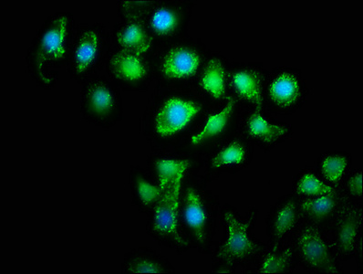 Immunofluorescence staining of A549 cells with CSB-PA734879LA01HU at 1:133, counter-stained with DAPI. The cells were fixed in 4% formaldehyde, permeabilized using 0.2% Triton X-100 and blocked in 10% normal Goat Serum. The cells were then incubated with the antibody overnight at 4°C. The secondary antibody was Alexa Fluor 488-congugated AffiniPure Goat Anti-Rabbit IgG(H+L).