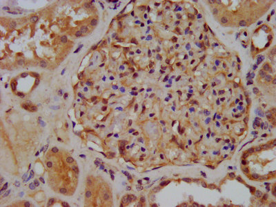 IHC image of CSB-PA026196LA01HU diluted at 1:300 and staining in paraffin-embedded human kidney tissue performed on a Leica BondTM system. After dewaxing and hydration, antigen retrieval was mediated by high pressure in a citrate buffer (pH 6.0). Section was blocked with 10% normal goat serum 30min at RT. Then primary antibody (1% BSA) was incubated at 4°C overnight. The primary is detected by a biotinylated secondary antibody and visualized using an HRP conjugated SP system.