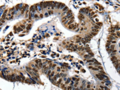 The image on the left is immunohistochemistry of paraffin-embedded Human colon cancer tissue using CSB-PA257066(XRCC6 Antibody) at dilution 1/10, on the right is treated with fusion protein. (Original magnification: ×200)