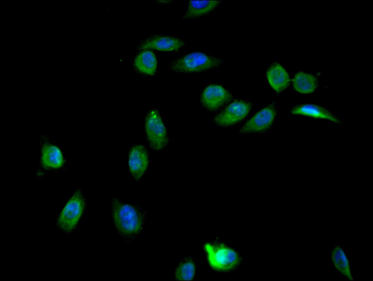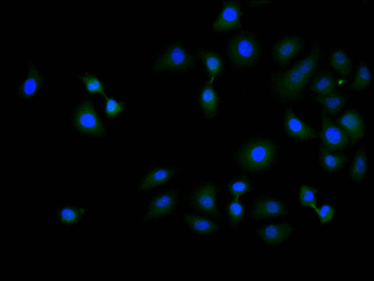 Immunofluorescence staining of Hela cell with CSB-PA026785LA01HU at 1:150, counter-stained with DAPI. The cells were fixed in 4% formaldehyde and blocked in 10% normal Goat Serum. The cells were then incubated with the antibody overnight at 4C. The secondary antibody was Alexa Fluor 488-congugated AffiniPure Goat Anti-Rabbit IgG(H+L).