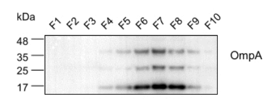 產(chǎn)品評(píng)價(jià): 我使用CSB-PA359226ZA01EOD抗體,對(duì)E.coli分泌的細(xì)菌胞外囊泡進(jìn)行WB檢測(cè),在不同密度梯度離心組分中,OmpA蛋白主要在6-8組分富集,條帶位置主要在35 kDa附近。