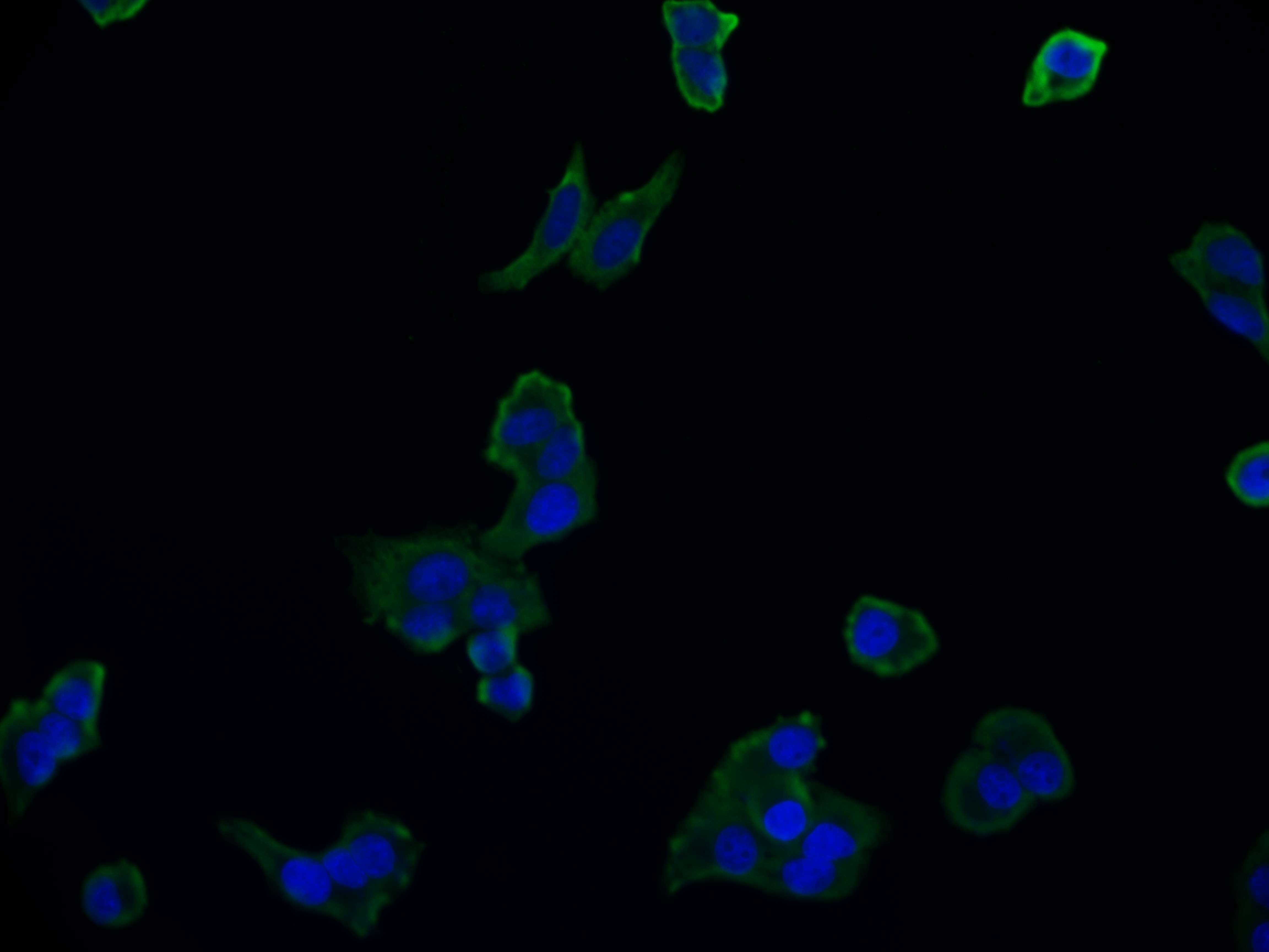Immunofluorescence staining of HepG2 cell with CSB-RA298469A0HU at 1:50, counter-stained with DAPI. The cells were fixed in 4% formaldehyde and blocked in 10% normal Goat Serum. The cells were then incubated with the antibody overnight at 4°C. The secondary antibody was Alexa Fluor 511-congugated AffiniPure Goat Anti-Rabbit IgG(H+L).