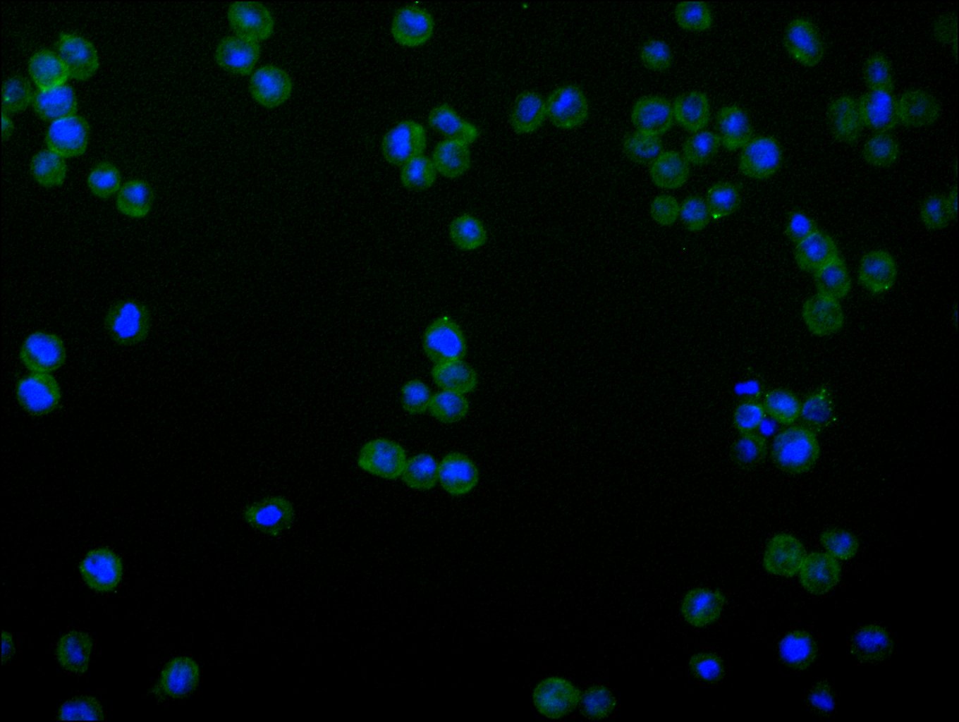 Immunofluorescence staining of THP-1 cell with CSB-RA986192A0HU at 1:50, counter-stained with DAPI. The cells were fixed in 4% formaldehyde, permeabilized using 0.2% Triton X-100 and blocked in 10% normal Goat Serum. The cells were then incubated with the antibody overnight at 4°C. The secondary antibody was Alexa Fluor 488-congugated AffiniPure Goat Anti-Rabbit IgG(H+L).