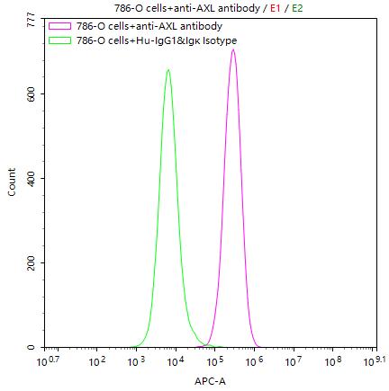 786-O cells were stained with Human IgG1&Igκ Isotype Control (CSB-RA011156MA1HU)(green line) and anti-AXL antibody (CSB-RA326981MA1HU) (2μg/1*106cells) (red line), washed and then followed by APC-conjugated anti-Human IgG Fc antibody and analyzed with flow cytometry.
