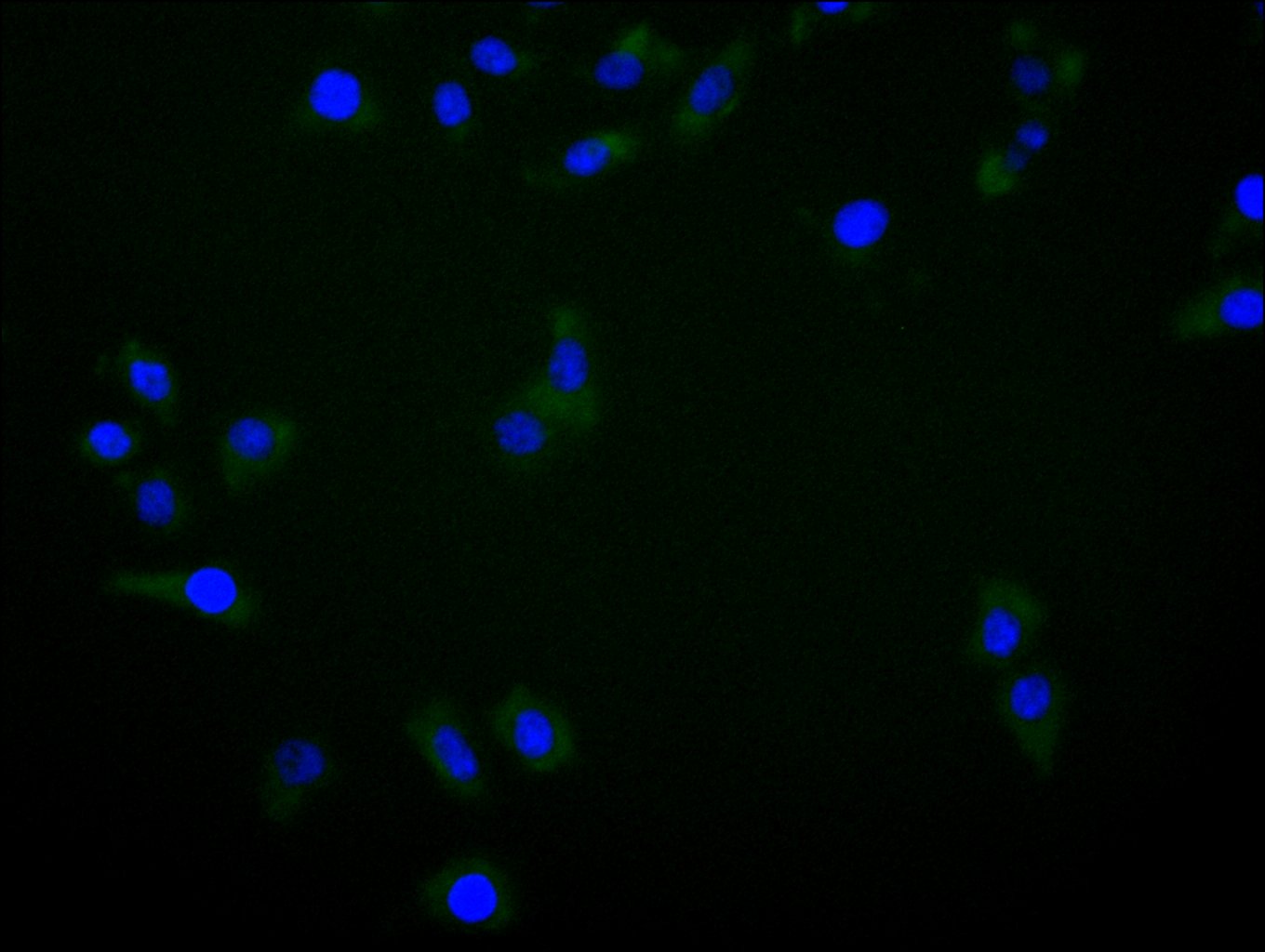 Immunofluorescence staining of PC-3 cell with CSB-RA326981MA1HU at 1:30, counter-stained with DAPI. The cells were fixed in 4% formaldehyde and blocked in 10% normal Goat Serum. The cells were then incubated with the antibody overnight at 4C. The secondary antibody was FITC-conjugated AffiniPure Goat Anti-Human IgG(H+L).