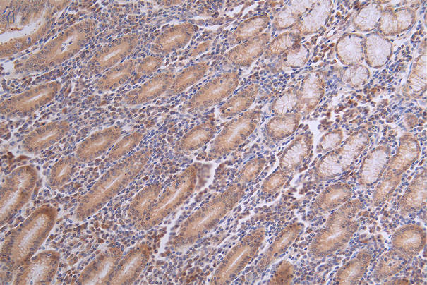 IHC image of CSB-RA003656A0HU diluted at 1:100 and staining in paraffin-embedded human stomach tissue performed on a Leica BondTM system. After dewaxing and hydration, antigen retrieval was mediated by high pressure in a citrate buffer (pH 6.0). Section was blocked with 10% normal goat serum 30min at RT. Then primary antibody (1% BSA) was incubated at 4°C overnight. The primary is detected by a Goat anti-rabbit polymer IgG labeled by HRP and visualized using 0.18% DAB.