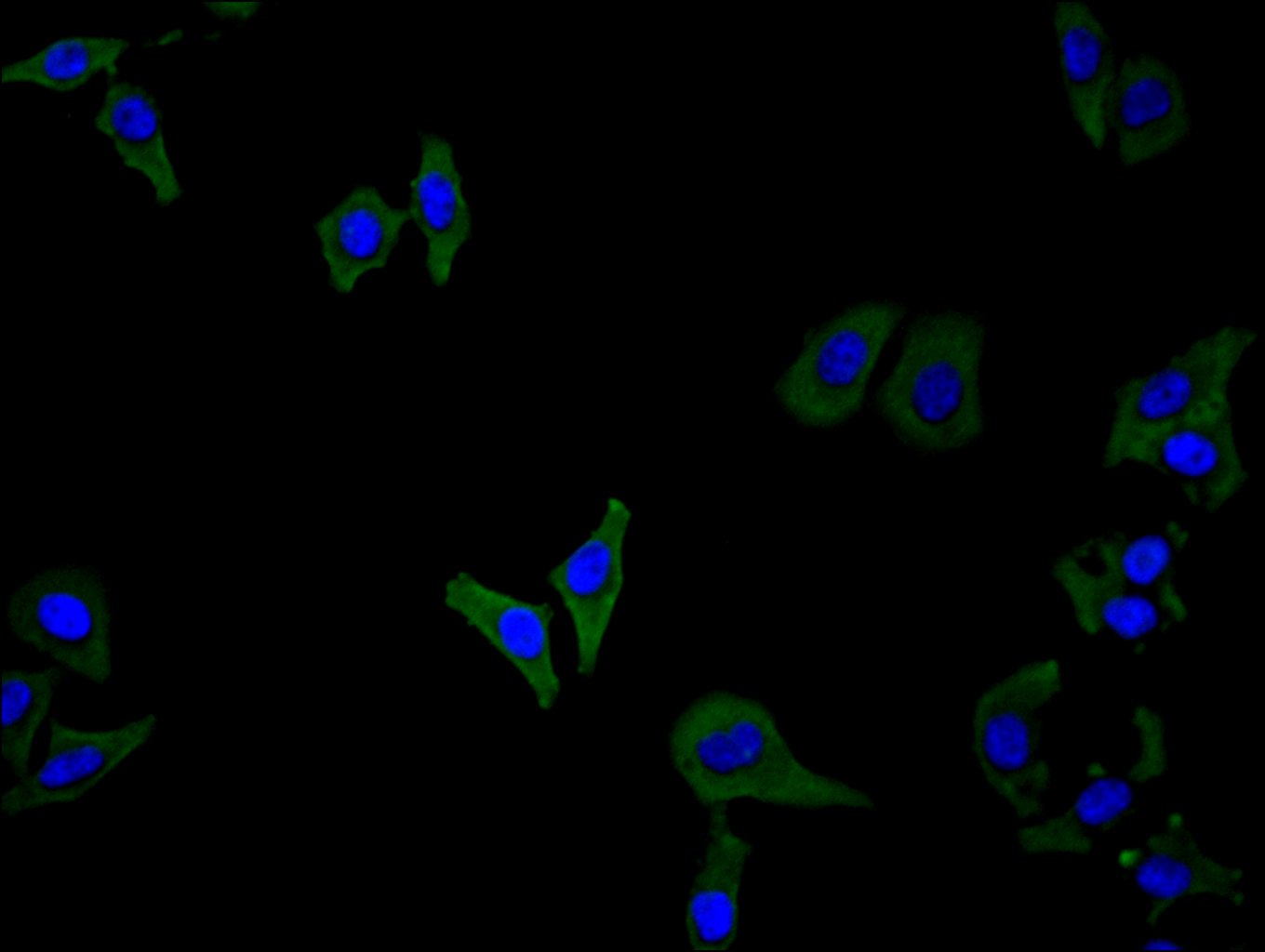 Immunofluorescence staining of Hela cell with CSB-RA006047MA1HU at 1:100, counter-stained with DAPI. The cells were fixed in 4% formaldehyde and blocked in 10% normal Goat Serum. The cells were then incubated with the antibody overnight at 4C. The secondary antibody was FITC-conjugated AffiniPure Goat Anti-Human IgG(H+L).