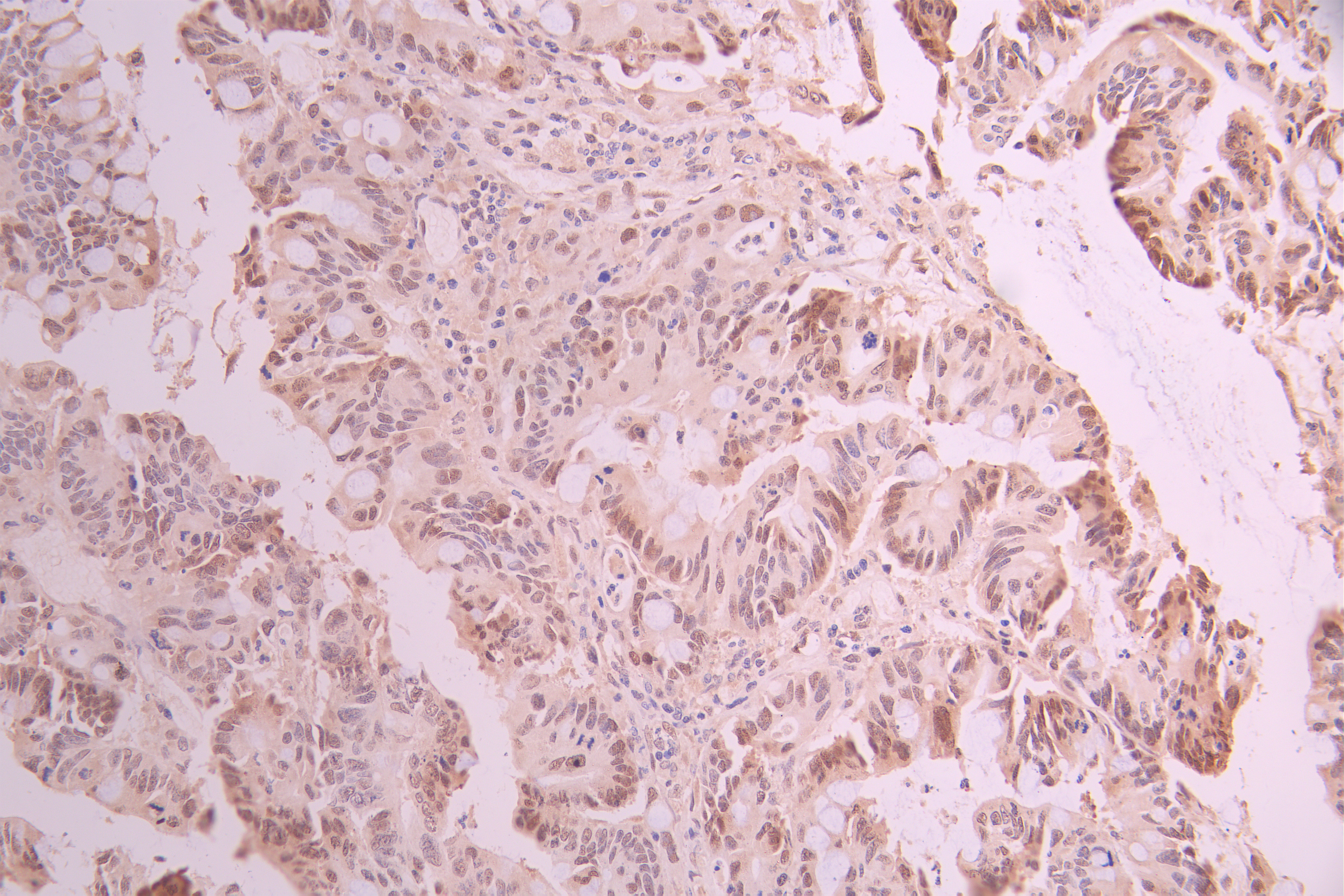 IHC image of CSB-RA081385A0HU diluted at 1:100 and staining in paraffin-embedded human colorectal cancer performed on a Leica BondTM system. After dewaxing and hydration, antigen retrieval was mediated by high pressure in a citrate buffer (pH 6.0). Section was blocked with 10% normal goat serum 30min at RT. Then primary antibody (1% BSA) was incubated at 4°C overnight. The primary is detected by a Goat anti-rabbit polymer IgG labeled by HRP and visualized using 0.05% DAB.