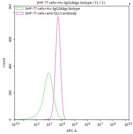 SHP-77 cells were stained with Human IgG1&Igκ Isotype Control (CSB-RA011156MA1HU)(green line) and anti-DLL3 antibody (CSB-RA882142MA2HU) (2μg/1*106cells) (red line), washed and then followed by APC-conjugated anti-Human IgG Fc antibody and analyzed with flow cytometry.